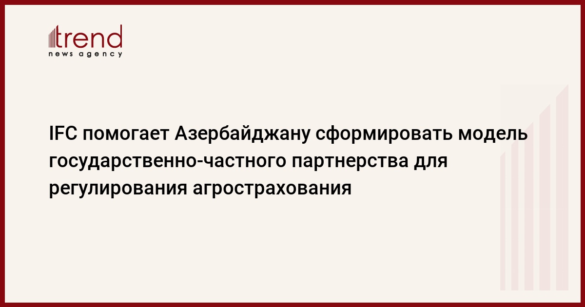 БАКУ /Trend/ - Международная финансовая организация (IFC) помогает Азербайджану сформировать модель государственно-частного партнерства, через которое будет осуществляться регулирование и управление системой аграрного страхования, сказала в четверг Trend глава Бакинского представительства IFC Алия Азимова.