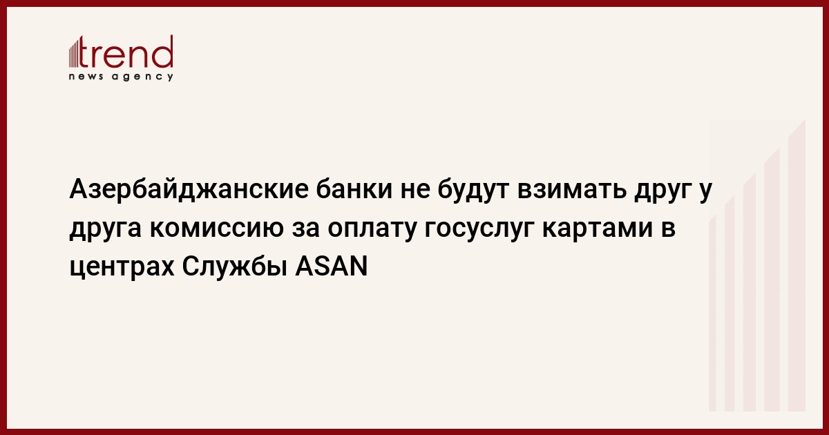 БАКУ /Trend/ - В центрах Службы ASAN в Азербайджане вводится нулевой тариф на взаимообменный сбор (interchange fee) за оплату услуг Государственного платежного портала (gpp.az), сообщает в понедельник Палата надзора над финансовыми рынками.