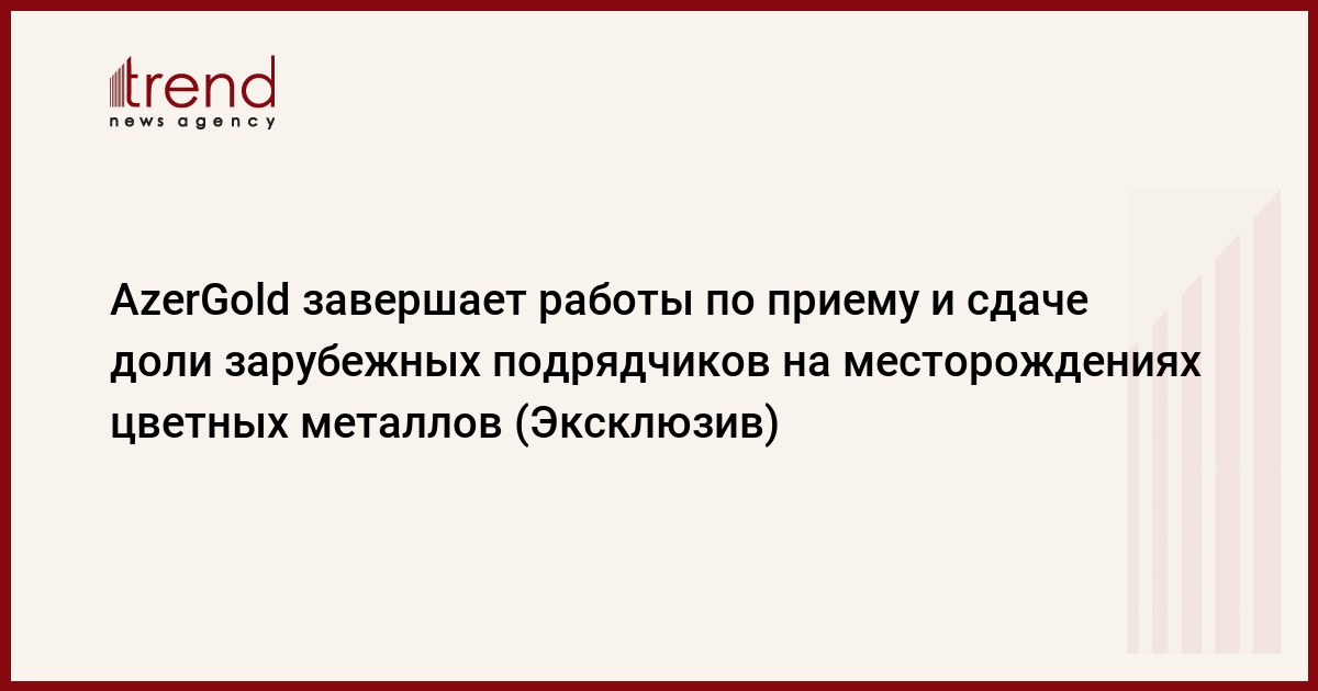 БАКУ /Trend/ - ЗАО AzerGold завершает работы по приему и сдаче доли зарубежных подрядчиков на некоторых рудниках и месторождениях в Азербайджане, сказал в эксклюзивном интервью Trend председатель правления компании Закир Ибрагимов.