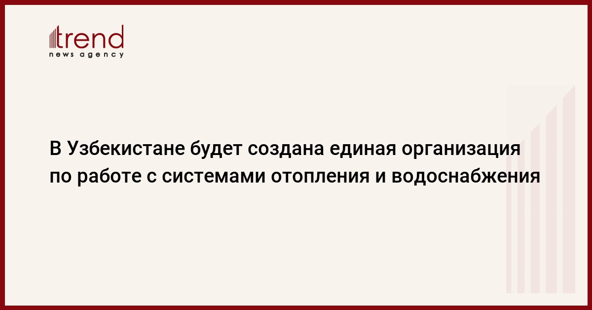 БАКУ /Trend/ - Власти Узбекистана намерены создать единую организацию, которая будет заниматься строительством, реконструкцией и ремонтом объектов тепло- и водоснабжения, а также канализации, сообщает «Подробно.uz» со ссылкой на проект постановления главы государства.