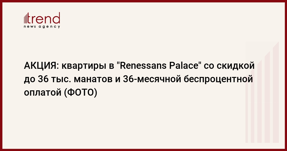 БАКУ /Trend/ - “Renessans Palace” – один из самых ярких строительных проектов в Баку предлагает ограниченную по времени кампанию, позволяющую приобрести квартиру премиум-класса с 36-месячной беспроцентной оплатой. Эту возможность можно осуществить в рамках «Осенней акции», начатой жилым комплексом премиум класса. Другие условия кампании изложены ниже: