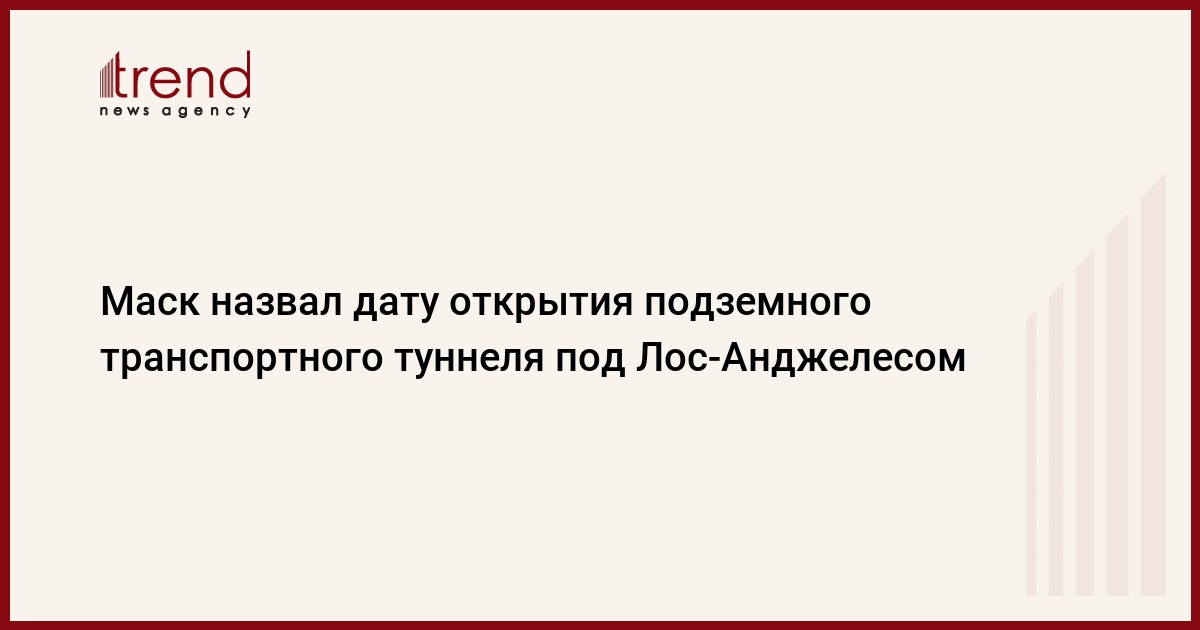 Подземный туннель под Лос-Анджелесом (штат Калифорния), задуманный бизнесменом Илоном Маском как альтернатива наземному транспорту и метро, почти готов к эксплуатации и начнет работать 10 декабря. Как передаёт ТАСС об этом Маск сообщил в Twitter.