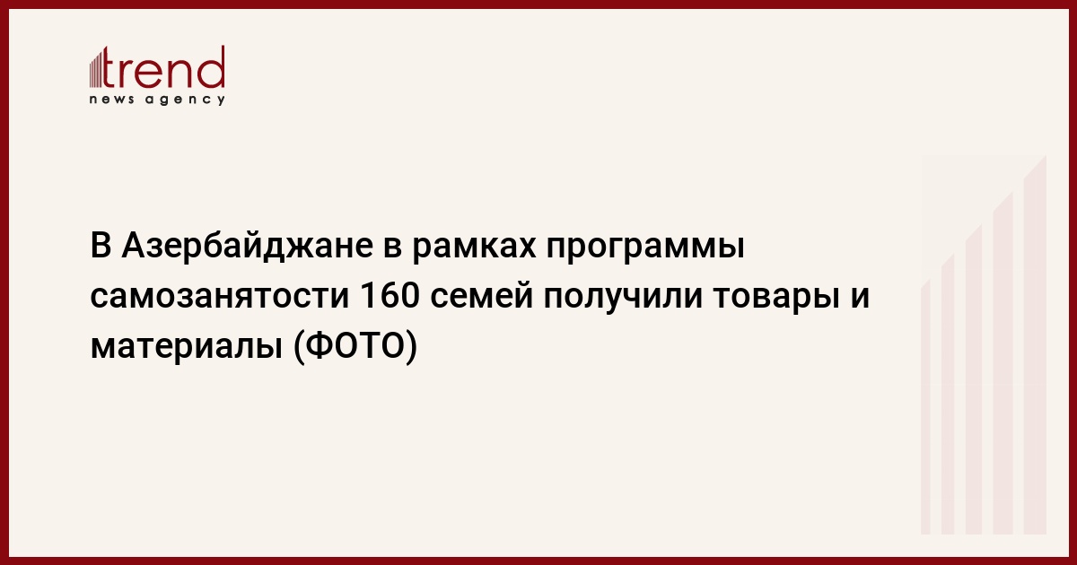 БАКУ /Trend/ - В Азербайджане в рамках программы самозанятости, осуществляемой согласно соответствующему указу главы государства, 160 участников программы получили товары и материалы от министерства труда и социальной защиты населения в ряде регионов (Габала, Лачин, Гах, Тертер, Билясувар, Шамахы, Кюрдемир и др).