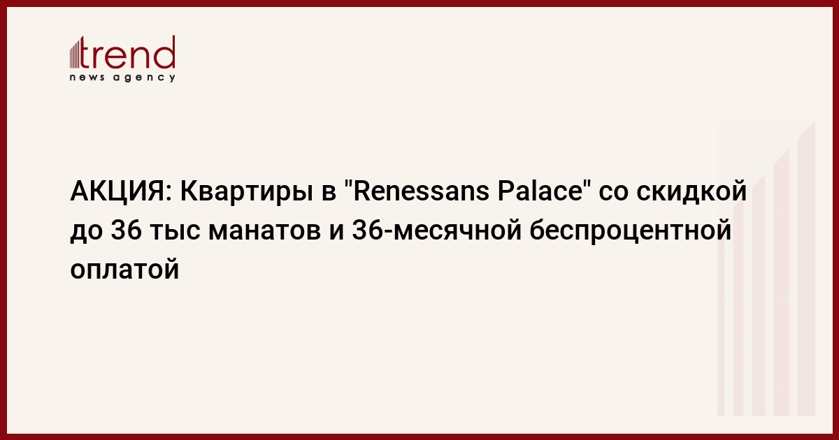 В рамках кампании квадратный метр квартир в “Renessans Palace” будет продаваться по цене от 1900 манатов. А это считается ниже текущей рыночной цены для жилого комплекса премиального класса.