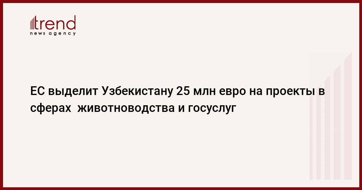 БАКУ /Trend/ - Европейский союз (ЕС) профинансирует проекты «Развитие сектора животноводства» и «Улучшение качества оказываемых государственных услуг органами юстиции в регионах республики» в Узбекистане общей стоимостью 25 миллионов евро, сообщает министерство иностранных дел Узбекистана.