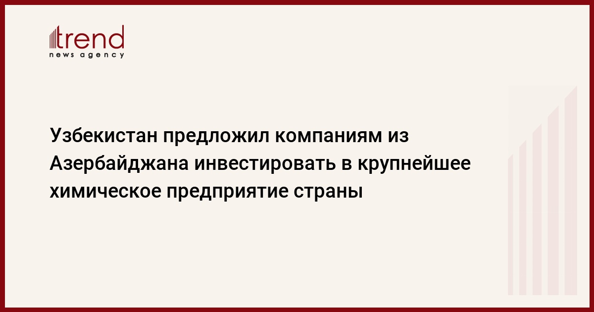 БАКУ /Trend/ - Государственный комитет Узбекистана по инвестициям приглашает азербайджанских предпринимателей инвестировать в проект расширения производственных мощностей завода «Ферганаазот», передаёт во вторник Trend со ссылкой на источники на рынке Узбекистана.