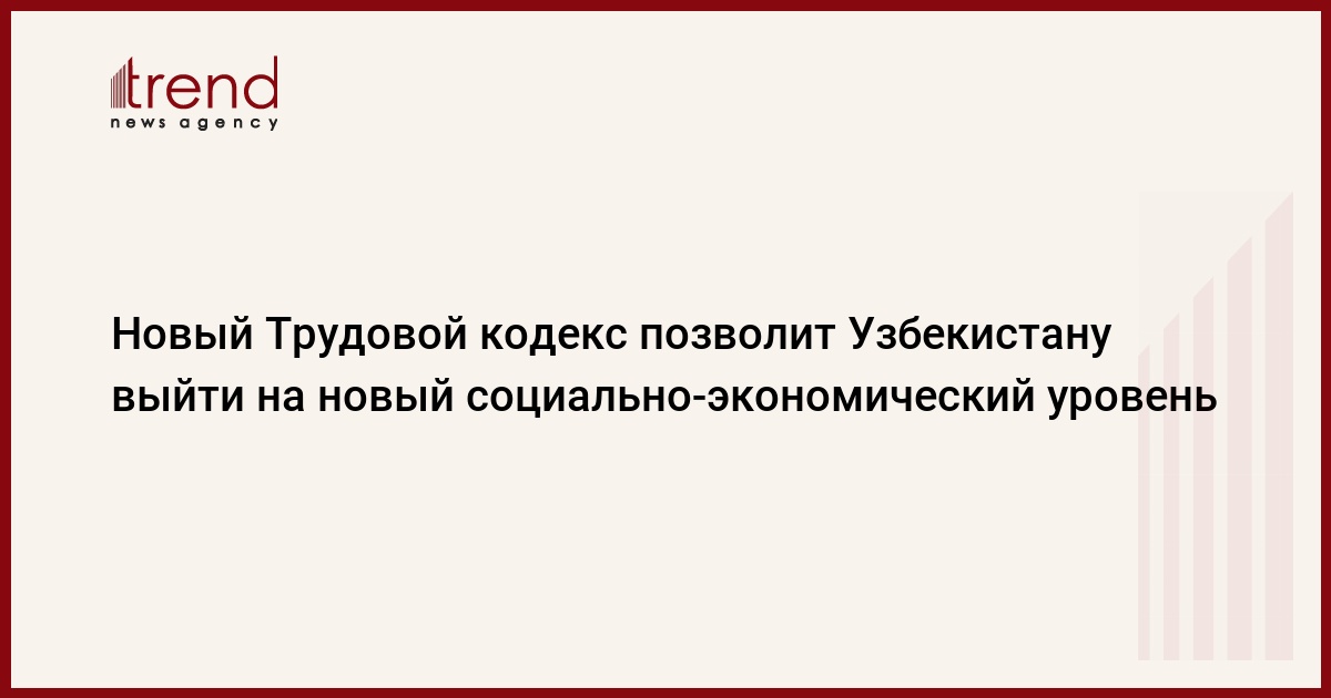 БАКУ/Trend/ - Новая редакция Трудового кодекса Узбекистана обеспечит выход трудовых отношения, трудового рынка на новый уровень, соответствующий требованиям современного этапа социально-экономического развития страны, и формирование благоприятной бизнес-среды.