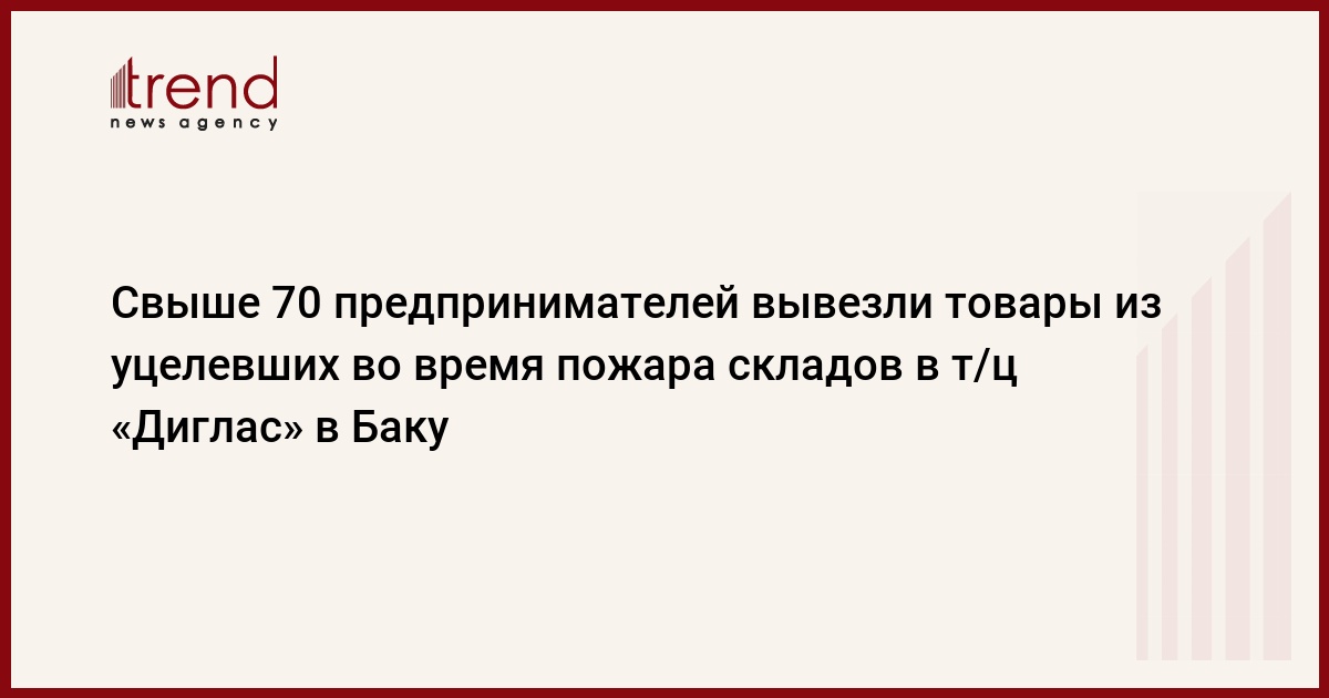 БАКУ /Trend/ - После инвентаризации товаров, которые сохранились в несгоревших складских помещениях торгового центра "Диглас" в Баку, 75 предпринимателей вывезли свои товары из этих помещений, сообщили во вторник Trend, в министерстве экономики Азербайджана.