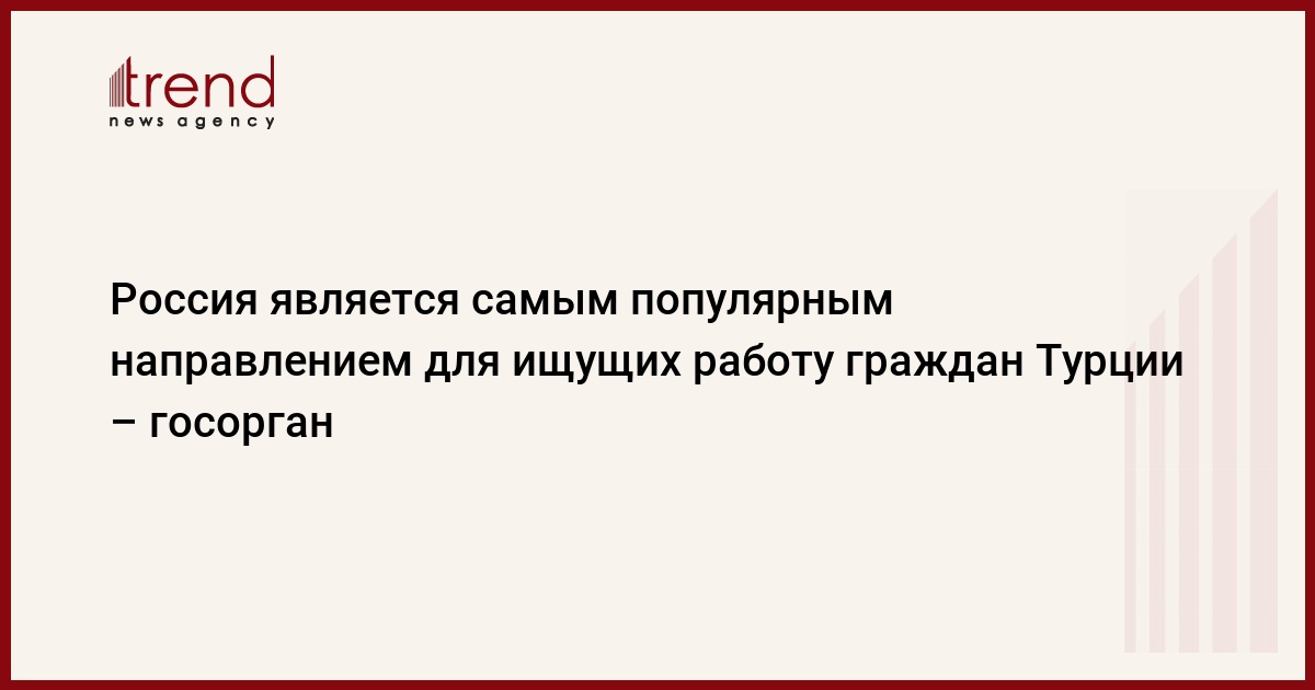 БАКУ /Trend/ - Россия является самым популярным направлением для граждан Турции, ищущих работу. Об этом в пятницу сообщили Trend в Главном управлении Службы занятости Турции (İŞKUR).