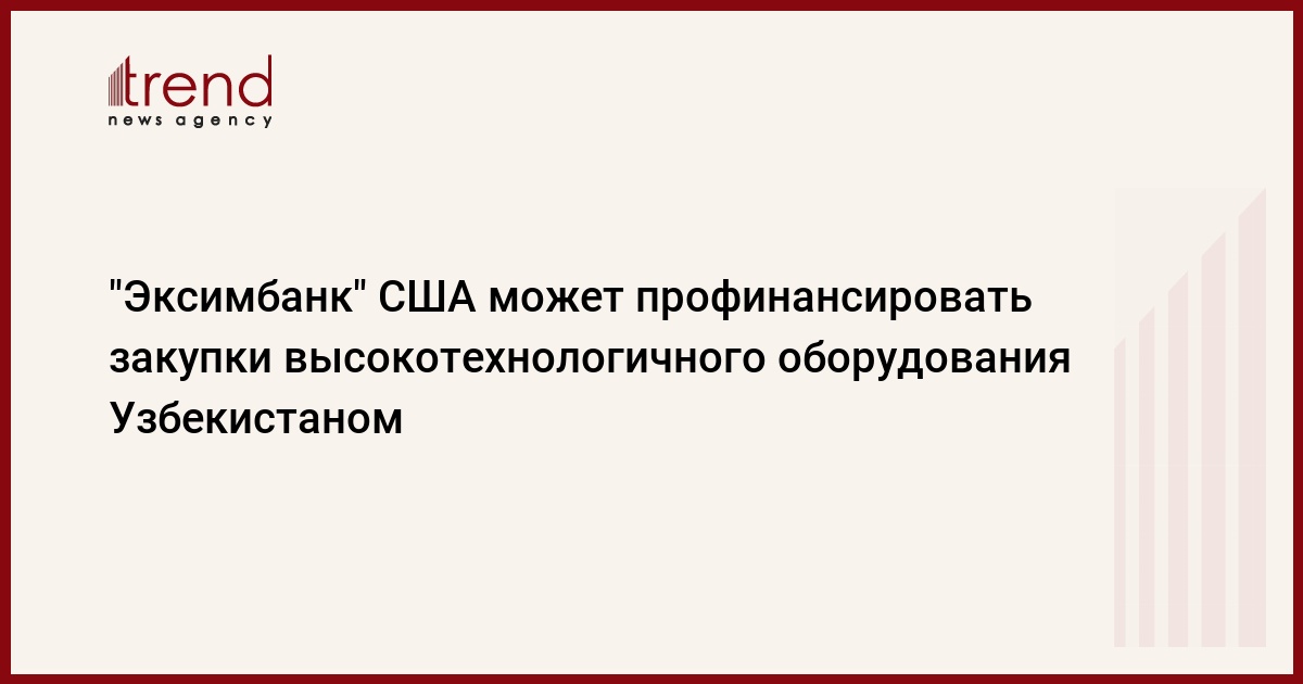 БАКУ/Trend/- «Эксимбанк» США может оказать содействие в финансировании закупок высокотехнологичного американского оборудования, приобретаемого Узбекистаном в рамках реализации совместных инвестиционных проектов, сообщает Trend со ссылкой на пресс-службу министерства инвестиций и внешней торговли Узбекистана.
