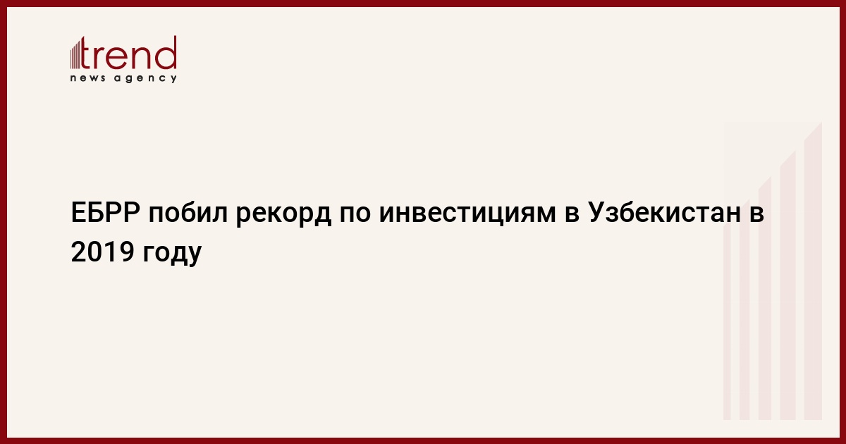 БАКУ/Trend/ - Европейский Банк Реконструкции и Развития (ЕБРР) достиг нового рекорда в Узбекистане в 2019 году, осуществив инвестиции в 13 проектов частного и государственного секторов в размере 576 миллионов долларов – крупнейший объём финансирования за всю историю работы банка в стране, сообщает Trend со ссылкой на узбекские СМИ.