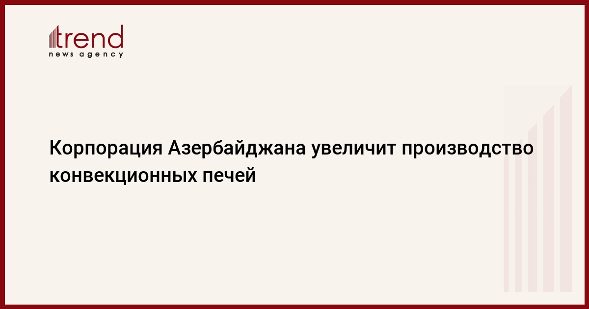 «В настоящее время корпорация планирует увеличить объемы производства этого вида оборудования до 20 процентов и выше. С начала года выпущено 10 штук таких печей. Параллельно предусмотрено нарастить также производство ротационных печей для использования в производстве хлеба. Корпорация выпустила 10 ротационных печей, и к концу года количество оборудования составит свыше 20-25 единиц. В минувшем году было реализовано оборудование, используемое в производстве хлеба на сумму свыше 100 тысяч манатов. В этом году по подсчетам корпорации данный показатель должен быть значительно выше. На внутреннем рынке оборудование продается за 10-11 тысяч манатов, и не предусмотрено для экспорта», - сказали в корпорации.