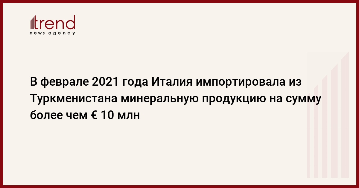 БАКУ /Trend/ - Италия импортировала минеральное топливо, минеральные масла и продукты их перегонки, битуминозные вещества и минеральные воски из Туркменистана на сумму более 10 миллионов евро в феврале 2021 года, сообщили Trend в Евростат.