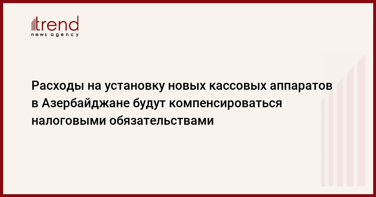 Как сообщили в среду Trend в минэкономики, согласно статьям 77.5 и 77.7 Налогового кодекса, расходы налогоплательщиков, устанавливающих контрольно-кассовые аппараты, отвечающие критериям, утвержденным Кабинетом министров, и подключенные в режиме реального времени к электронной информационной системе налоговой службы, на установку каждого кассового аппарата компенсируются налоговыми обязательствами, возникающими после их установки в пределах, утвержденных главой государства.