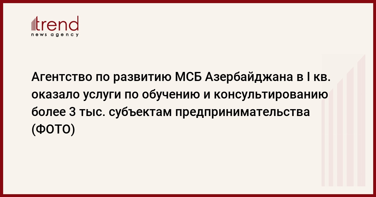 БАКУ /Trend/ - В первом квартале текущего года Агентство по развитию малого и среднего бизнеса (МСБ) Азербайджана оказало услуги по обучению и консультированию более 3000 субъектам микро-, малых и средних предприятий, а также желающим открыть свой бизнес.