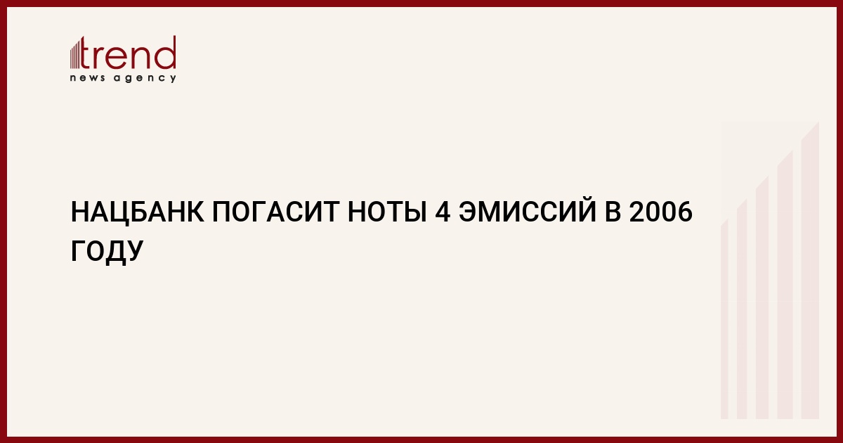 Hациональный банк Азербайджана планирует в 2006б году погасить ноты четырех эмиссий, объявление которых планируется на 2005 год. Как сообщили Trend в Hациональном банке Азербайджана, одна из данных эмиссий должна быть объявлена в ноябре, а три остальные в декабре.