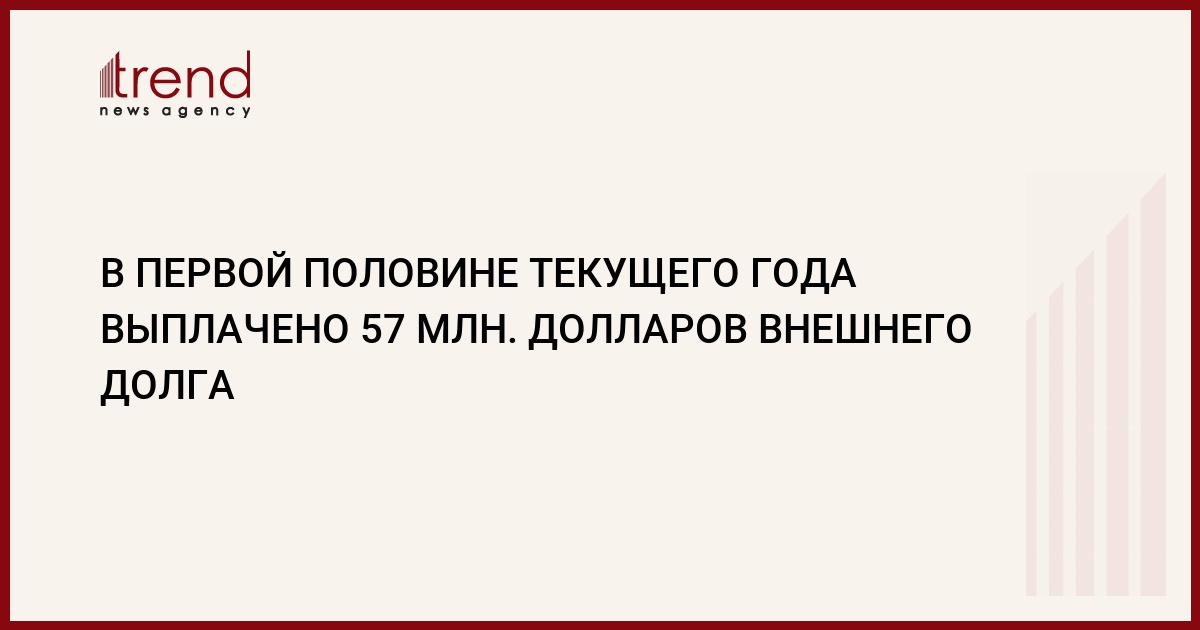 В первой половине текущего года правительство Азербайджана выплатило 57 млн. долларов внешнего долга ряду международных финансовых организаций. Как сообщили Trend в Управлении внешнеэкономических связей Министерства финансов, 47,4 млн. долларов из этой суммы составил основной долг, а 9,6 млн. долларов - проценты за кредит. 40,6 млн. долга выплачены государственными учреждениями (АЗАЛ, "Азерэнержи", "Азеркимия", "Азерсу" и др.), а 4 млн. долларов - из государственного бюджета. Из валютных запасов Hационального банка истрачено 12,4 млн. долларов на возвращение кредитов, взятых в Международном валютном фонде.