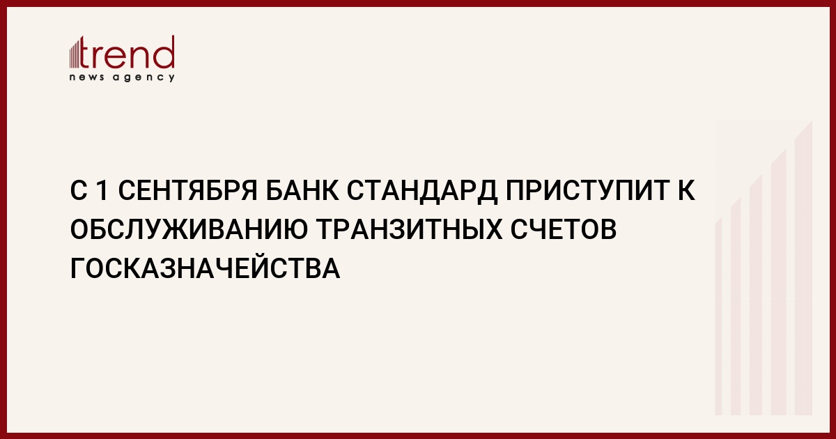 С 1 сентября Банк Стандард приступит к обслуживанию транзитных счетов государственного Казначейства. Как сообщили Trend в банке, отбор коммерческих банков для обслуживания казначейских счетов проводился на основе конкурса, объявленного Главным казначейским управлением Министерства финансов.
