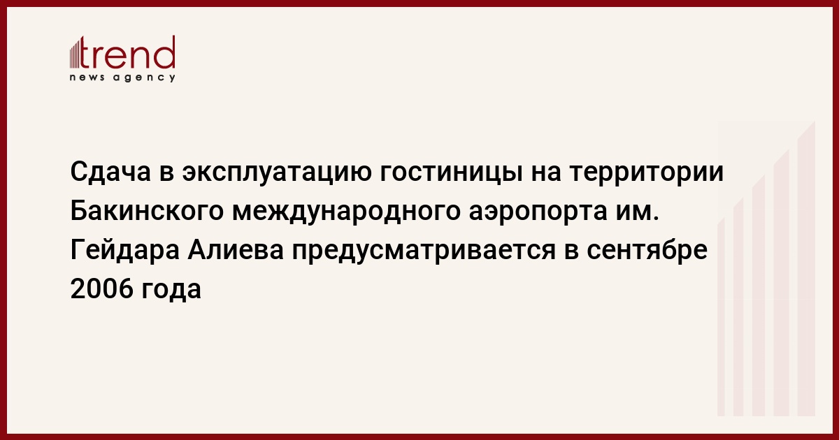 Сдача в эксплуатацию гостиницы на территории Бакинского международного аэропорта им Гейдара Алиева предусматривается в сентябре 2006 года, сообщил Trend заместитель председателя Госконцерна AZAL по эксплуатации и строительству аэропортов Этибар Гусейнов.