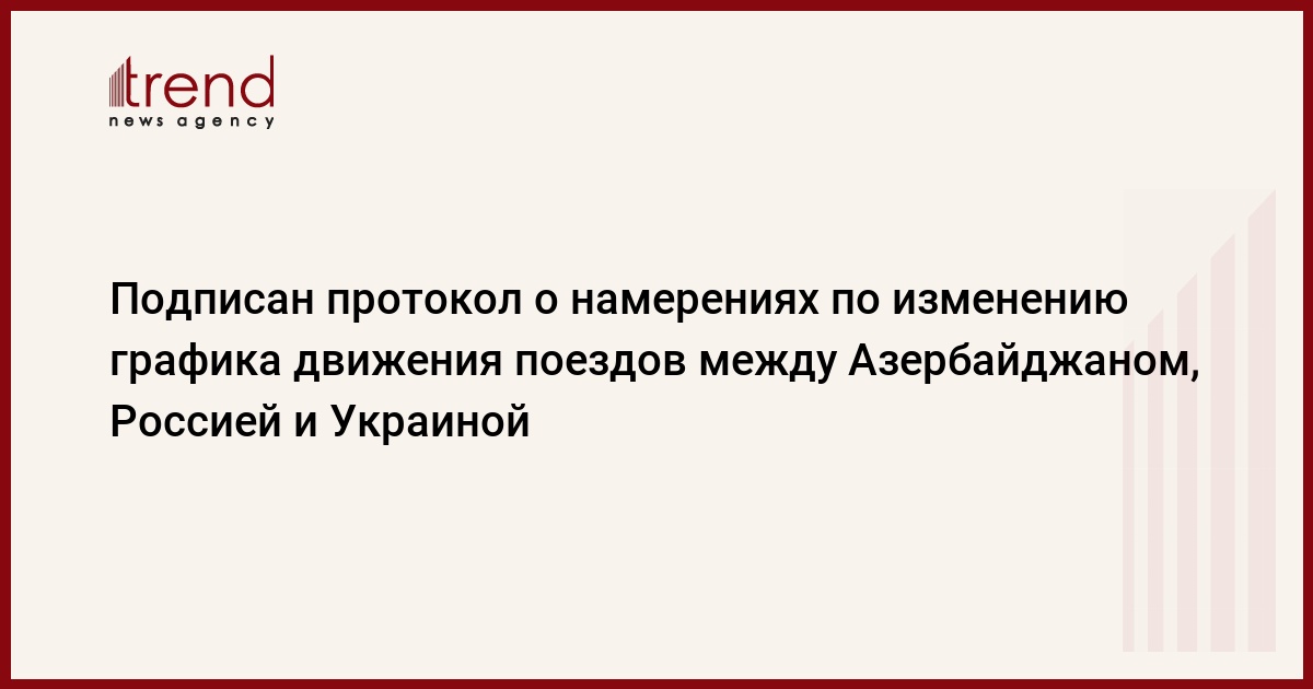 Изменение графика движения международных пассажирских поездов в 2006-2007 гг. обсуждалось в Баку представителями железнодорожных ведомств Азербайджана, России и Украины, сообщили Trend в Азербайджанской государственной железной дороге. По итогам заседания подписан протокол о намерениях по изменениям в графике движения.