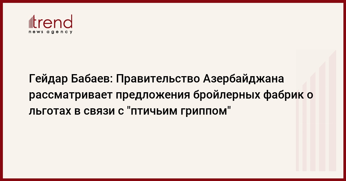 Правительство Азербайджана рассматривает предложения бройлерных фабрик о предоставлении льгот в связи с эпидемией "птичьего гриппа". Как передает Trend , 2 марта на пресс-конференции министр экономического развития (МЭР) Гейдар Бабаев сказал, что МЭР предлагает заморозить в течение 3 месяцев выплаты задолженности бройлерных фабрик за коммунальные услуги. По его мнению, также предполагается приостановить выплаты задолженности бройлерных фабрик по налогам, что допускается законодательством Азербайджана в случае форсмажорных ситуаций.