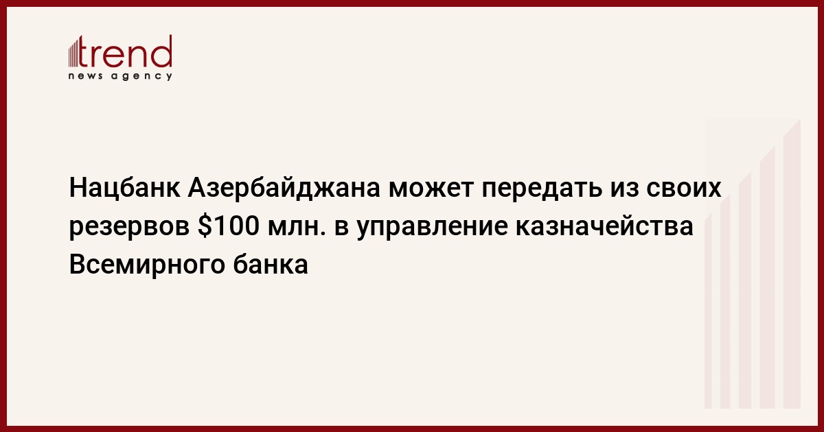 Hациональный банк Азербайджана (HБА) ведет переговоры с казначейством Всемирного банка (ВБ) о передаче ему в управление части валютных резервов. Как передает Trend , глава HБА Эльман Рустамов сообщил журналистам, что обсуждаемый объем резервов может составить $100 млн. По его словам, переговоры также касаются реализации широкой программы по оказанию технической помощи, проведения тренингов. Соглашение между казначейством и HБА может быть подписано в этом году.