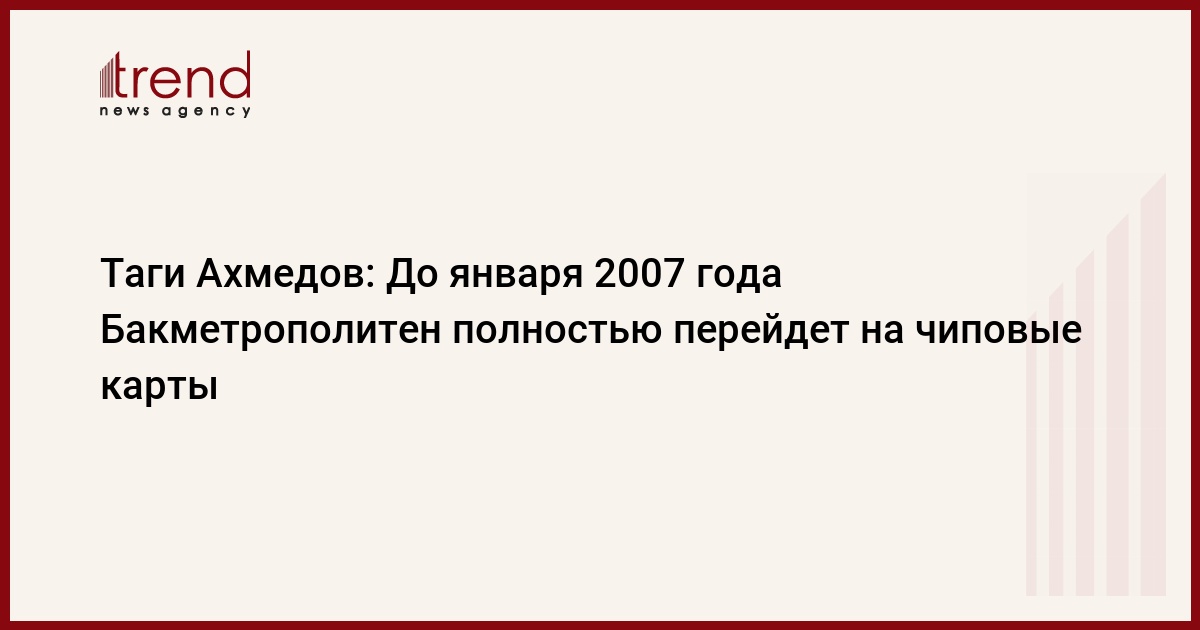 Бакинский метрополитен намерен полностью перейти на оказание услуг чиповыми картами до января 2007 года. Об этом, как передает Trend , сообщил 24 марта на пресс-конференции глава Бакметрополитена Таги Ахмедов.