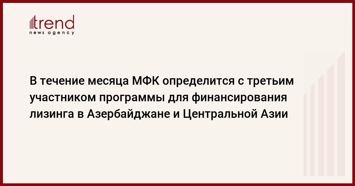 В течение месяца Международная финансовая корпорация (МФК) примет решение о финансировании AG Leasing за счет специального фонда, предназначенного для программы развития лизинга в странах Центральной Азии и Азербайджана, сообщил Trend руководитель проекта МФК Эльчин Ахмедов.