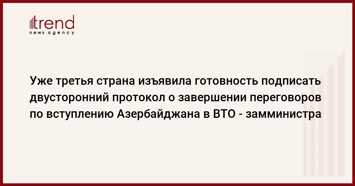 Оман выразил готовность к подписанию с Азербайджаном двустороннего протокола о завершении переговоров в рамках вступления АР во Всемирную торговую организацию, сообщил Trend замминистра иностранных дел, глава переговорной группы Махмуд Мамедкулиев. Об этом страна была проинформирована в ходе прошедших в секретариате ВТО встреч.