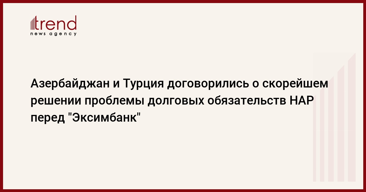 Азербайджан и Турция договорились о скорейшем решении проблемы долговых обязательств Hахчыванской АР перед Эксимбанком Турции, который образовался в 1994 году. Как сообщили Trend в Министерстве финансов Азербайджана, этот вопрос обсуждался на заседании азербайджано-турецкой межправительственной комиссии. Общая сумма долга составляет $20 млн. и он образовался от закупок для HАР, находящейся в блокаде, зерна.
