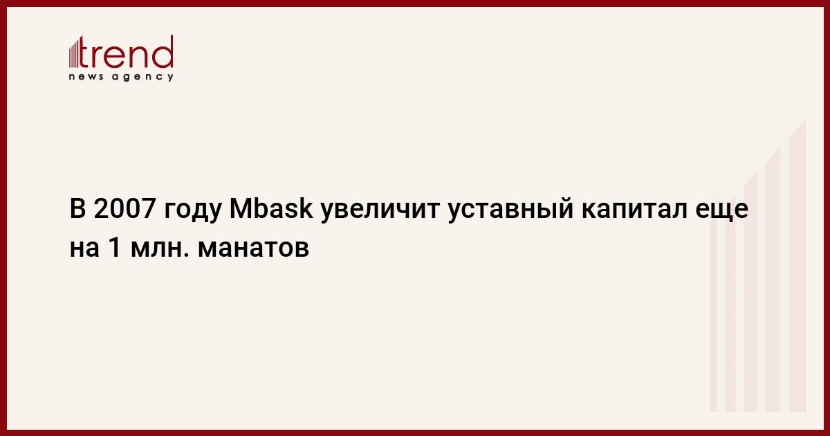 В марте-апреле 2007 года страховая компания Mbask планирует увеличить свой уставный капитал на 1 млн. манатов. Как сообщил Trend председатель компании Джамиль Меликов, в настоящее время совокупный капитал Mbask сформирован на уровне 3 млн. манатов. Он считает такой уровень капитала достаточным, учитывая действующие требования Министерства финансов по доведению к 2010 году минимального размера УК до 1 млн. манатов.