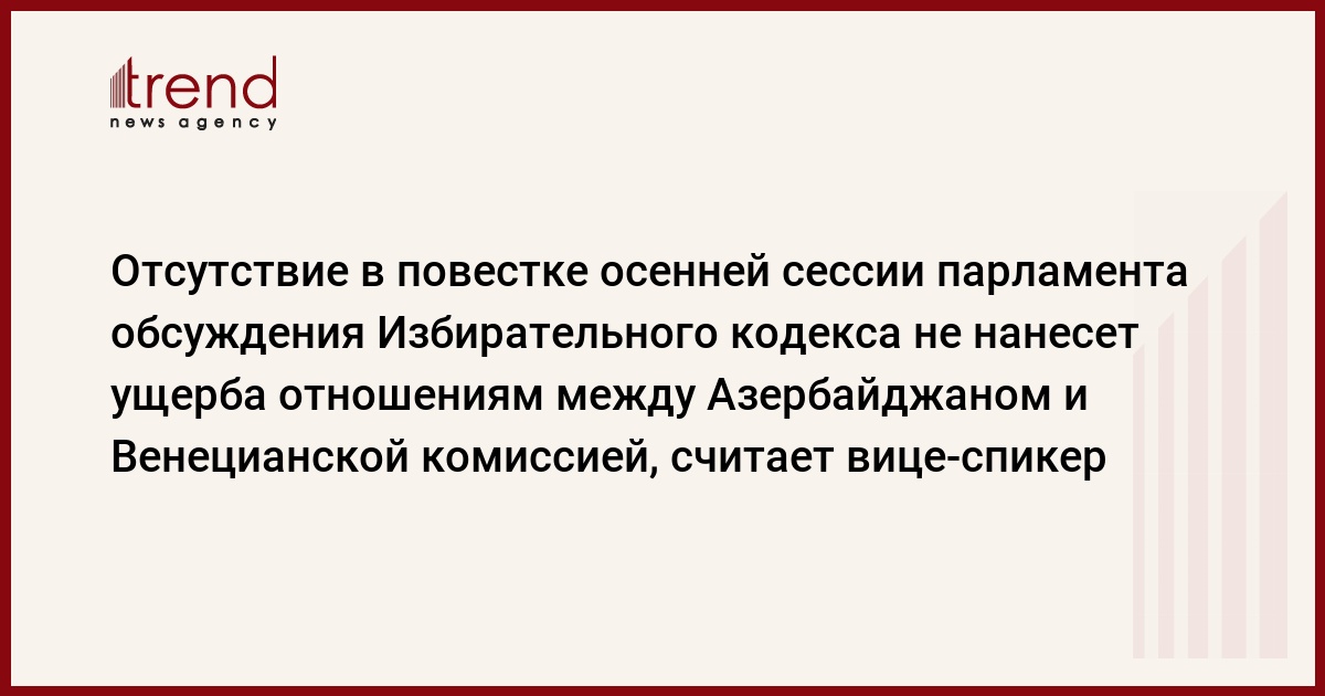 То, что Избирательный кодекс не вынесен на обсуждение на осенней сессии Милли меджлиса, не станет фактором, который нанесет ущерб отношениям между Азербайджаном и Венецианской комиссией Совета Европы. Об этом Trend заявила вице-спикер Мили меджлиса Бахар Мурадова.