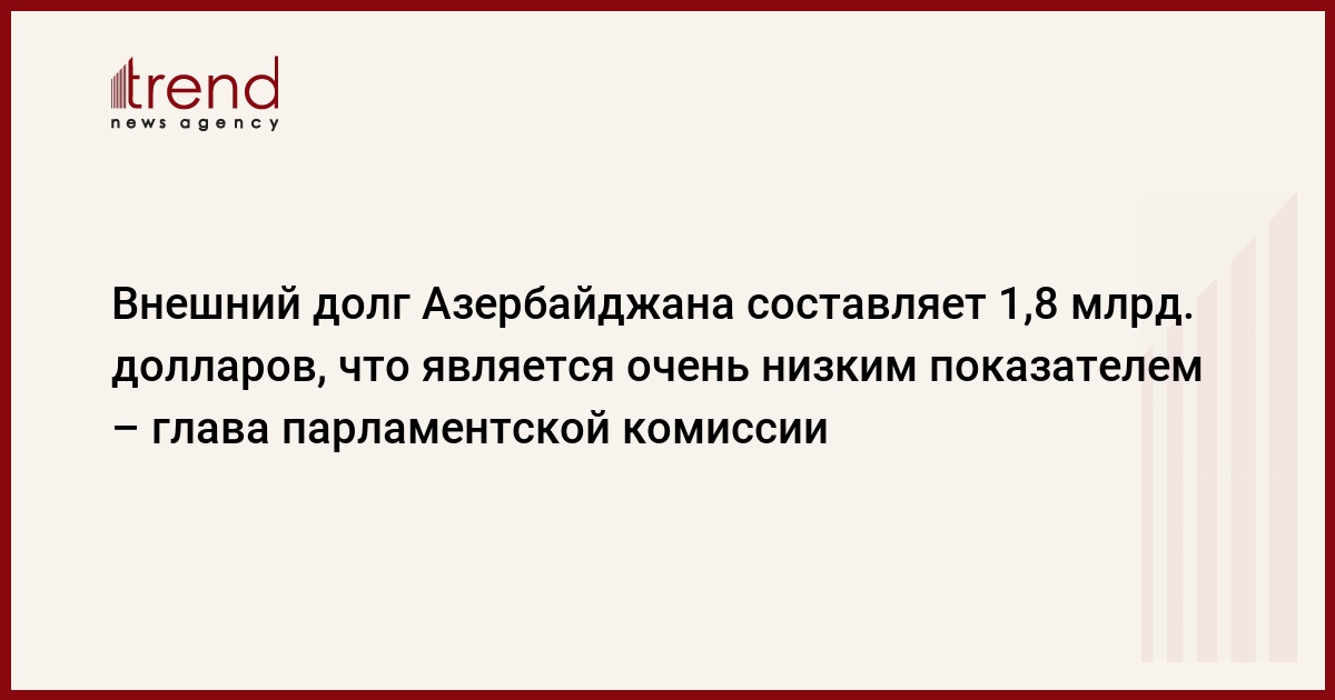 Внешний долг Азербайджана составляет 1,8 млрд. долларов. Как передает Trend , об этом сообщил председатель постоянной комиссии Милли меджлиса по экономической политике, академик Зияд Самедзаде. Он отметил, что Азербайджан для осуществления экономического развития привлекает кредиты. "При этом необходимо усовершенствование долговой политики. Долговая политика Азербайджана является основным компонентом стратегии развития. Внешний долг Азербайджана составляет 1,8 млрд. долларов. Отношение этого долга к внутреннему валовому продукту составляет 9,2%. Это очень низкий показатель",- сказал З. Самедзаде.