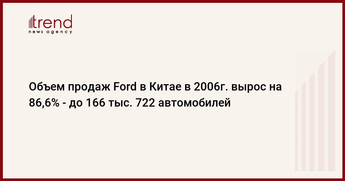 Объем продаж американского автомобильного концерна Ford Motor Co. в Китае в 2006г. вырос на 86,6% по сравнению с 2005г, сообщает Trend со ссылкой на РБК.
