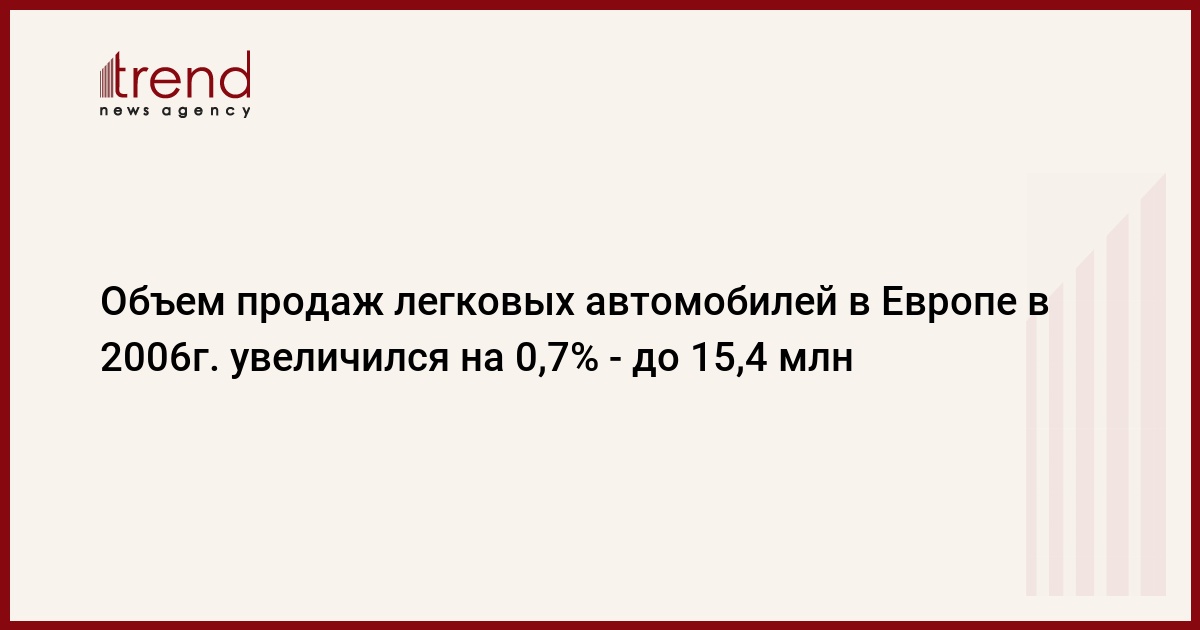Объем продаж легковых автомобилей в Европе, включая новых членов ЕС, в 2006г. увеличился на 0,7% по сравнению с 2005г. - до 15 млн 364 тыс. 997 машин. При этом, как сообщается в отчете Европейской ассоциации автопроизводителей (ACEA), за декабрь 2006г. объем продаж снизился на 0,3% по сравнению с аналогичным периодом 2005г. - до 1 млн 68 тыс. 553 автомобилей, сообщает Trend со ссылкой на РБК.