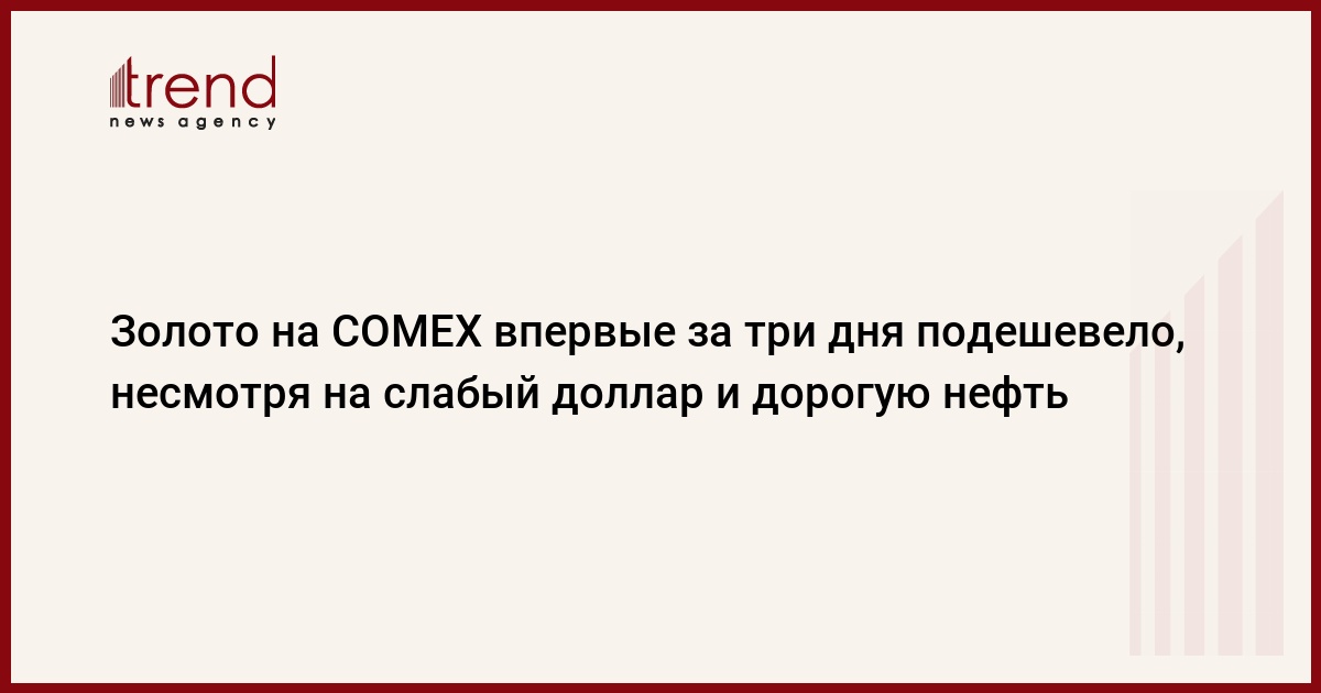 Тройская унция золота на COMEX 12 апреля подешевела за день на 2 долл. (-0,3%) после того, как за два предыдущих дня ее цена выросла на 4,8 долл./унция. Официальная цена фьючерса на июнь составила 679,7 долл./унция - самый низкий показатель за три дня. Цены по сделкам были ниже котировок предыдущей сессии и составляли 675,5-684,6 долл./унция. При этом минимальная цена сделки соответствовала самой низкой котировке за пять сессий, передает РБК .