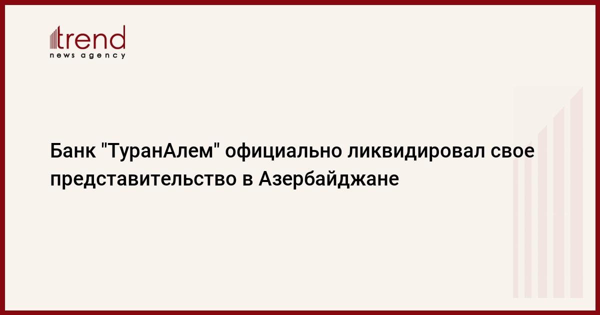 Азербайджан, Баку /корр. Trend И.Халилова / Решением Совета директоров казахстанского банка "ТуранАлем" ликвидировано представительство в Азербайджане, говорится в сообщении в официальной печати. Банк зарегистрировал в Министерстве юстиции Азербайджана открытие бакинского представительства 8 июня 2005 года, однако официальное разрешение на его открытие так и не было предоставлено Национальным банком Азербайджана. В соответствии с новым банковским законодательством даже на открытие представительства банка в АР требуется разрешение НБА.