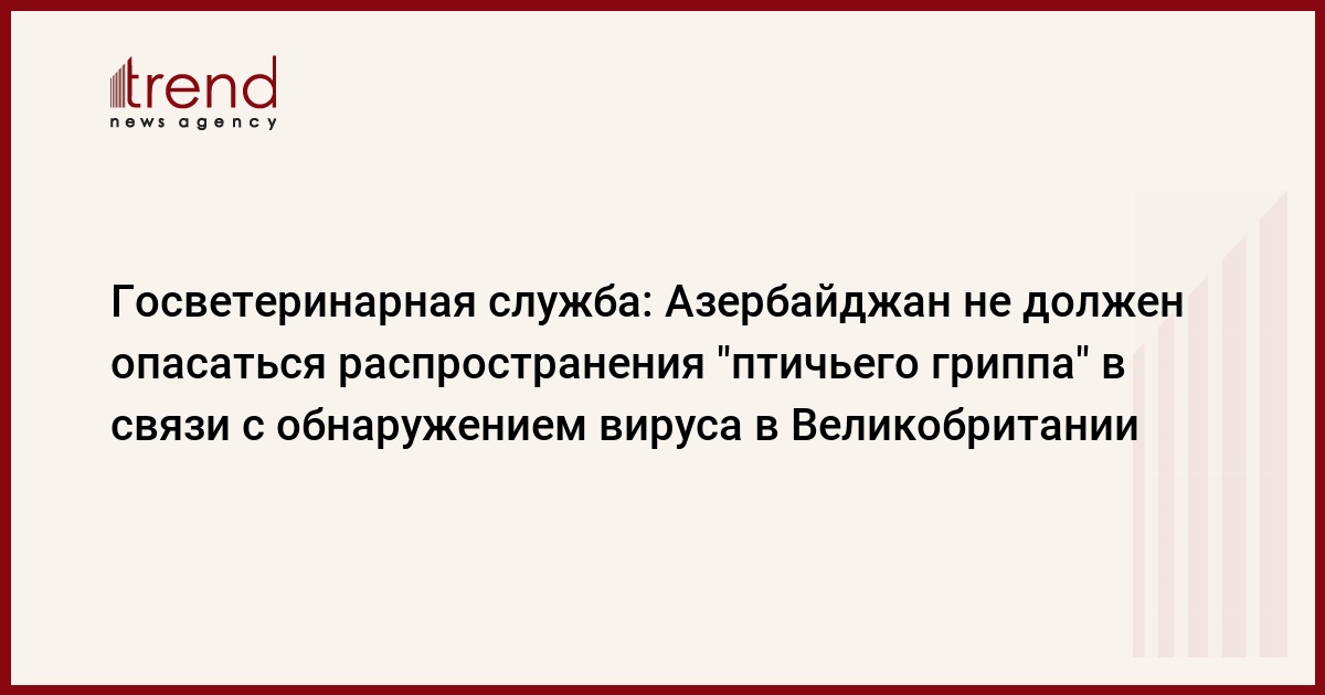Азербайджан, Баку /корр. Trend С.Бабаева/ Азербайджан может не опасаться распространения вируса "птичьего гриппа" в стране в связи с недавно выявленными фактами этого заболевания в Великобритании, сообщил во вторник пресс-секретарь Государственной ветеринарной службы при министерстве сельского хозяйства Йолчу Ханвели.