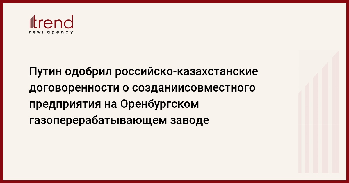 Президент России Владимир Путин одобрил российско-казахстанские договоренности о создании совместного предприятия на Оренбургском газоперерабатывающем заводе. На него ежегодно будет поступать 5 млрд кубометров казахстанского газа, передает ИТАР-ТАСС .