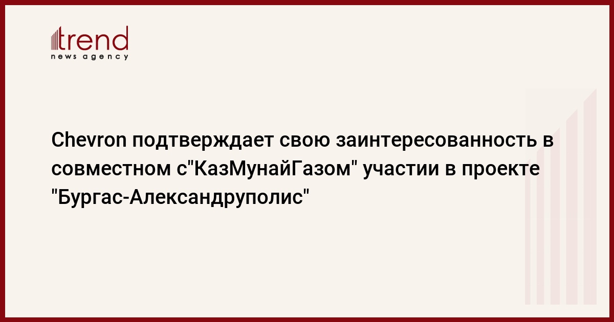 "Мы приветствуем прогресс по "Бургас-Александруполис", который снизит нагрузку на пролив Босфор. С расширением КТК Chevron будет заинтересован в партнерстве с "КазМунайГазом" в данном проекте ("Бургас-Александруполис". - "ИФ-К")", - отмечается в тексте выступления Дж.Киркланда на 17-м пленарном заседании совета иностранных инвесторов (СИИ) при президенте Казахстана, распространенном пресс-службой главы государства.