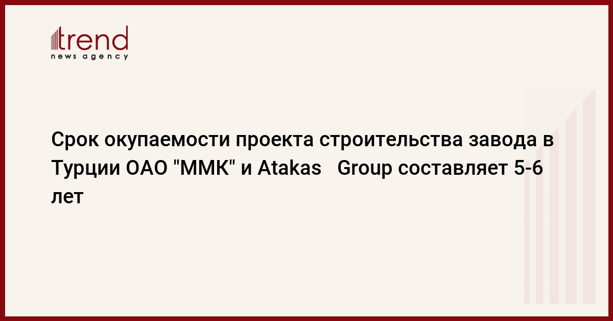 Срок окупаемости проекта строительства завода в Турции ОАО "Магнитогорский металлургический комбинат" (ММК) и Atakas Group составляет 5-6 лет, сообщается в презентационных материалах ММК.