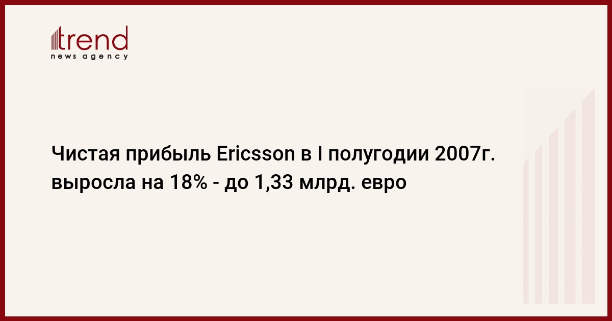 Чистая прибыль Ericsson во II квартале 2007г. выросла на 12% - до 6,4 млрд шведских крон (697 млн евро) по сравнению с 5,7 млрд шведских крон (620 млн евро), полученными за аналогичный период годом ранее. Объем продаж компании во II квартале 2007г. увеличился на 6% и составил 47,6 млрд шведских крон (5,18 млрд евро) против 44,8 млрд шведских крон (4,88 млрд евро) годом