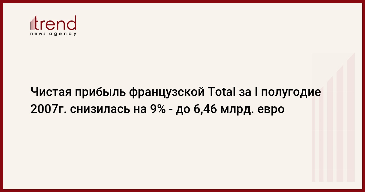 Чистая прибыль французской нефтяной компании Total SA за I полугодие 2007г. снизилась на 9% - до 6,46 млрд евро по сравнению с 7,12 млрд евро, полученными за аналогичный период годом ранее. Об этом говорится в опубликованном сегодня финансовом отчете компании.