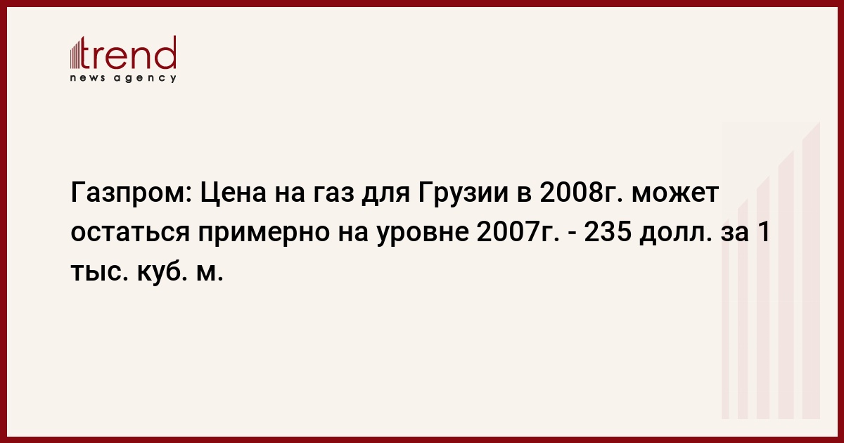 Цена российского газа для Грузии в 2008г. может остаться примерно на том же уровне, что и в текущем году, - 235 долл. за 1 тыс. куб. м, заявил в эфире радиостанции "Эхо Москвы" официальный представитель Газпрома Сергей Куприянов. Он отметил, что эту цену Грузия сейчас платит нормально. Точные объемы газа, которые Газпром поставит грузинским потребителям, С.Куприянов