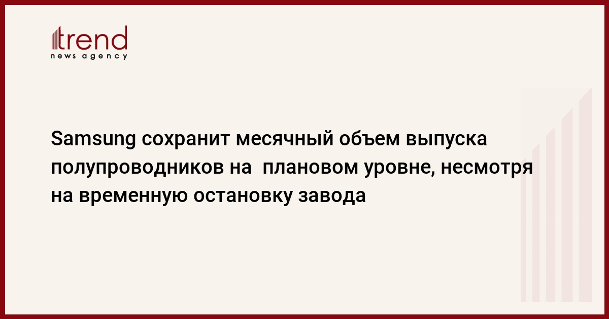 Южнокорейская компания Samsung Electronics Co. намерена сохранить месячный объем выпуска полупроводников на запланированном уровне, несмотря на произошедшую остановку завода, сообщает Reuters. Компания рассчитывает наверстать выпуск продукции за счет повышения производительности, передает РБК .