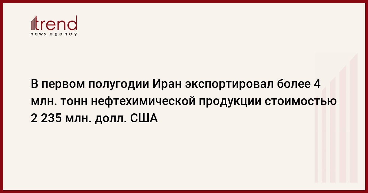 Отдел общественных связей Иранской торговой нефтехимической компании сообщил ИРНА, что в пером полугодии 1386 иранского года Иран экспортировал 4 019 тыс. т нефтехимической продукции стоимостью 2 235 млн. долл. США.