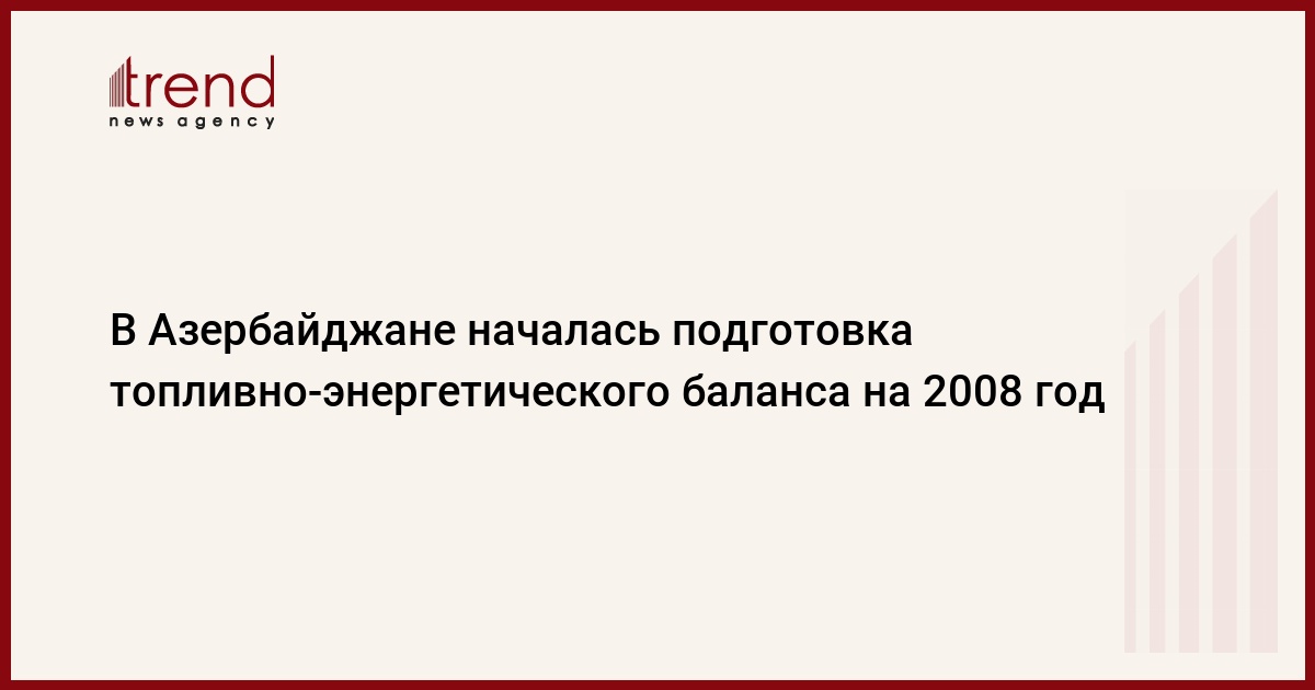 Азербайджан, Баку /корр. Trend С.Алиев/ Министерство промышленности и энергетики Азербайджана начало подготовку топливно-энергетического баланса страны на 2008 год. Он будет подготовлен к концу ноября - началу декабря этого года, сообщили в правительстве.