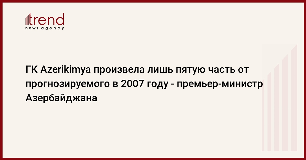 Азербайджан, Баку, 14 марта / корр. Trend И.Халилова/ В 2007 году на предприятиях ГК Azerikimya произведено продукции на 125,5 млн. манатов, что составляет лишь 20,8 процентов от прогнозируемого объема и на 15,3 процентов меньше 2006 года, сказал премьер-министр Азербайджана Артур Расизаде, представляя в пятницу в парламенте отчет правительства страны по итогам социально-экономического развития в 2007 году