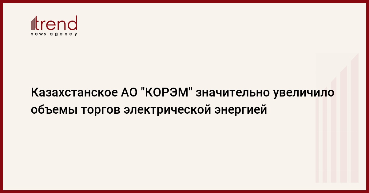 Казахстан, Астана, 14 августа /корр. Trend К. Конырова/ Оператор рынка централизованной торговли Казахстана - АО "КОРЭМ" значительно увеличил объемы торгов электрической энергией, которые к концу 2007 года достигли 9,5 млрд. кВт/ч, превысив в 1,64 раз прогнозные данные, что составило 15 процентов от объема оптового рынка электроэнергии Казахстана, сообщает пресс-служба Ассоциации "KazEnergy".