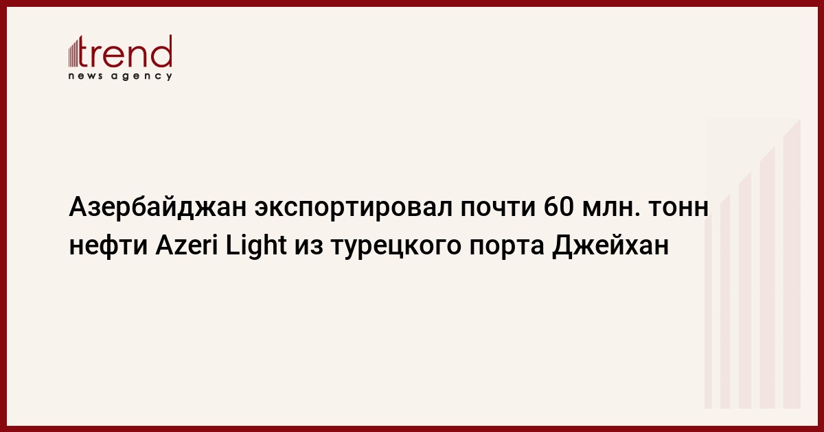 Азербайджан, Баку, 26 августа /корр. Trend Э.Исмайлов, С.Ильхамгызы/ Азербайджан с 2006 года по август 2008 года экспортировал из турецкого порта Джейхан на мировые рынки более 440 млн. барр. (почти 60 млн. тонн) легкой нефти сорта Azeri Light, добываемой на месторождении "Азери-Чираг-Гюнешли".